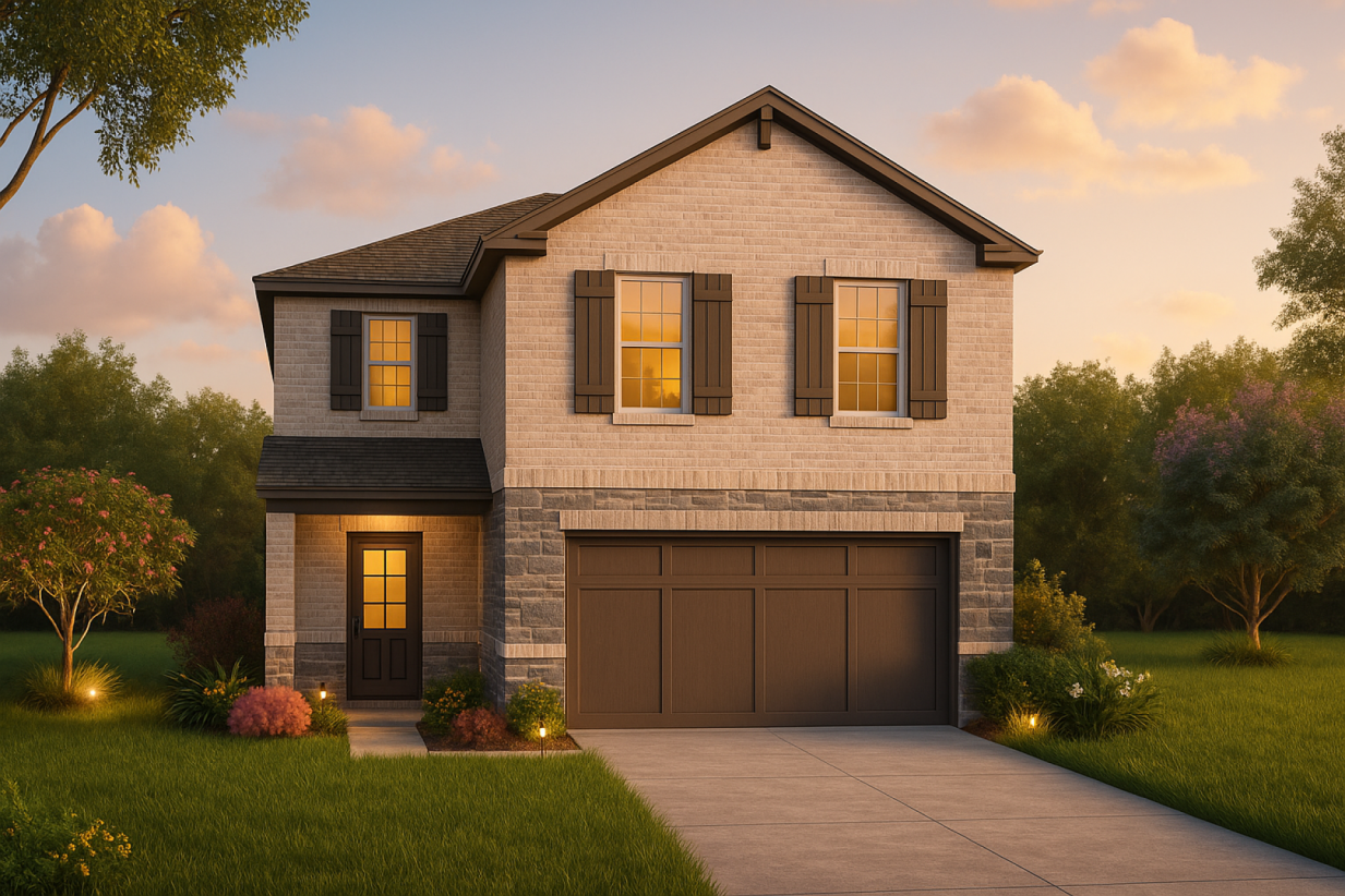 This two-story home centers around an open kitchen, dining area, and family room that creates a comfortable setting for cooking, gathering, and everyday connection. A walk-in pantry and extra storage nearby help keep things organized, while a powder bath and welcoming entry support the flow of daily routines. Upstairs, the primary bedroom features a spacious walk-in closet, set apart from the secondary bedrooms for added privacy. A bright loft anchors the second floor and offers extra room for work, play, or relaxation. With well-placed storage and a smart layout from top to bottom, the design supports a variety of lifestyles.