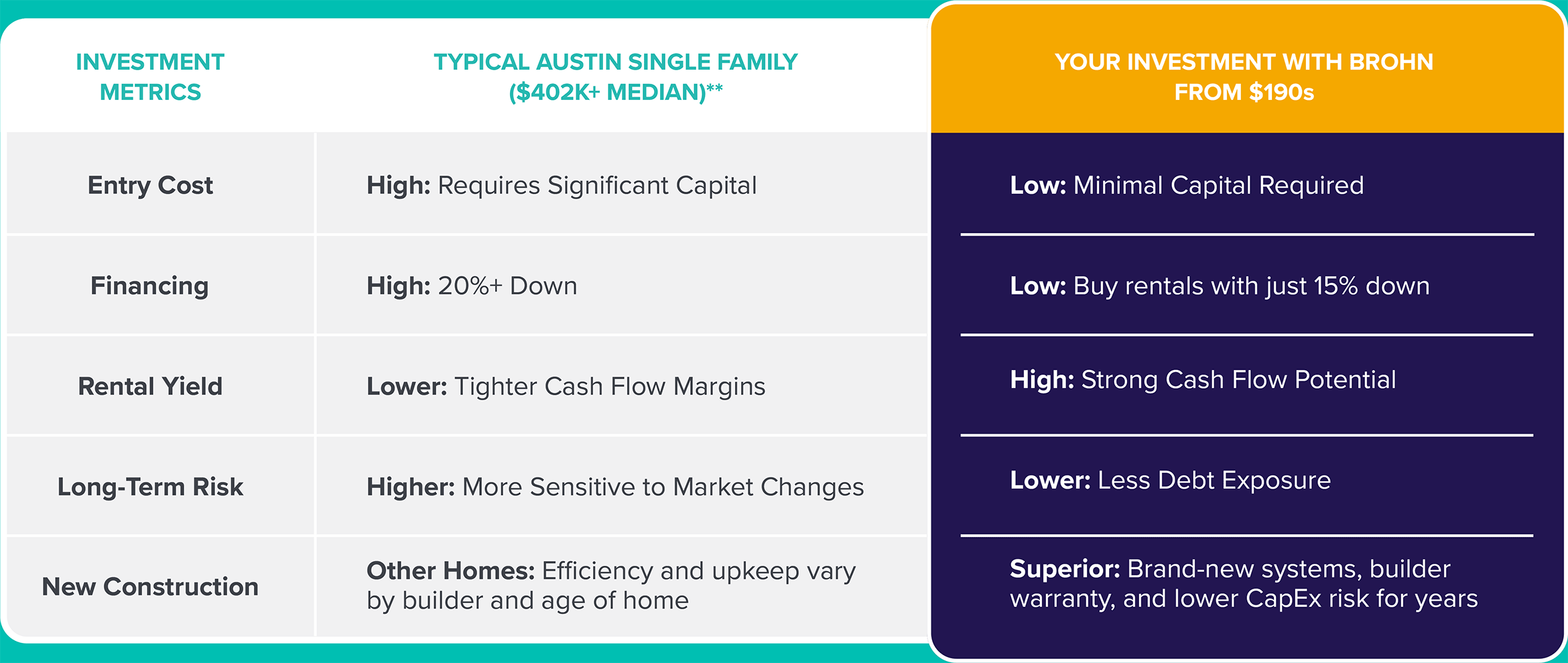Investors across Texas choose Brohn because affordability never comes at the expense of quality. Every Brohn home is built with durable materials, modern energy-efficient systems, and our award-winning warranty and helping protect your cash flow from major repair costs for years. Lower upfront price. Lower ongoing maintenance. Higher long-term performance.